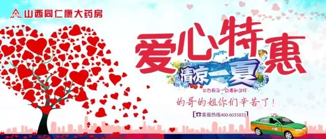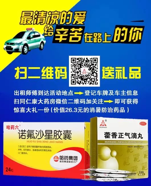 山西同仁康大藥房太原市與孝義市各藥房在7月7日--9日為“的哥、的姐”送上我們***真摯的祝愿,我們?yōu)槟呐谥屏讼顩霾韫┠赓M(fèi)飲用。并且現(xiàn)場掃碼即可獲贈價值26.3元的消暑防治藥品(天士力集團(tuán)的藿香正氣滴丸和哈藥集團(tuán)的諾氟沙星膠囊),同時現(xiàn)場還免費(fèi)贈送您價值5元的優(yōu)惠券四張,持此券您可在山西同仁康各藥房特惠購藥。